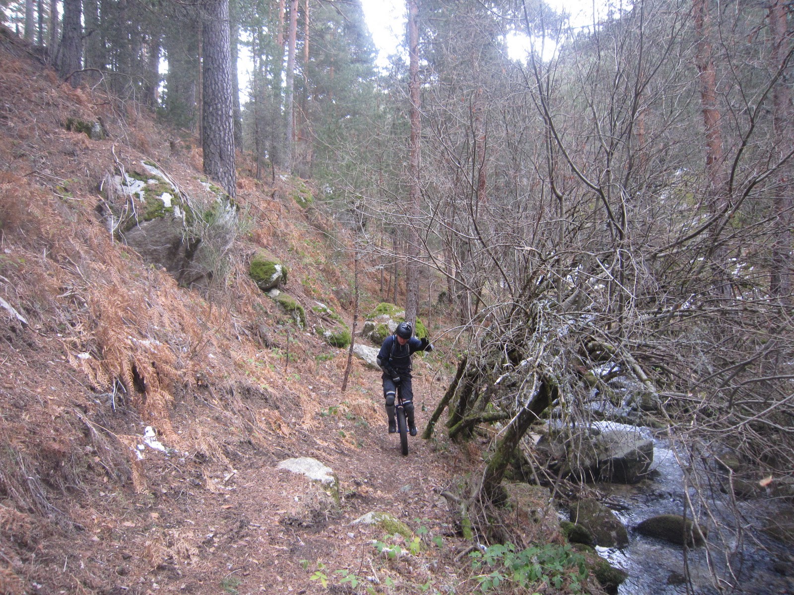 Ya en los últimos tramos, ya que una vez llegas al camino asfaltado, si tiras por él hasta el final, se nos podía hacer mas aburrido, decidimos seguir haciendo lo que venimos haciendo desde el principio; fuera de pista, por las bajadas entre pinos, ramas y sobre el lecho de ramas, helechos, acículas amontonadas con el tiempo.